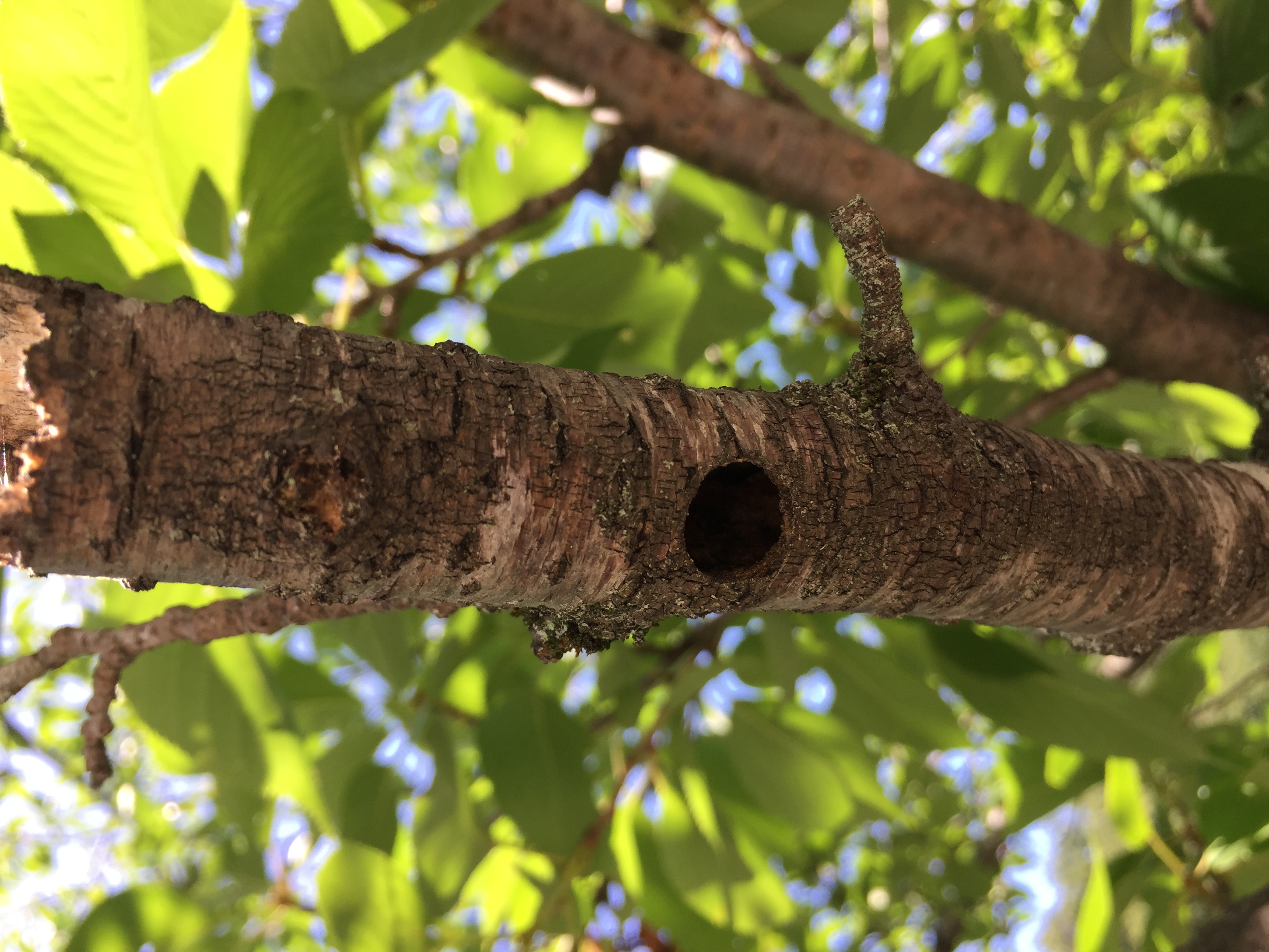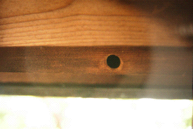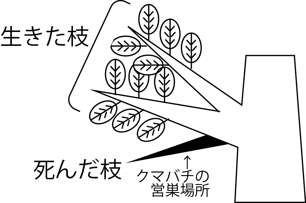 | クマバチの巣。真下に向いた真ん丸の穴をあける。公園のサクラなどで、その気に