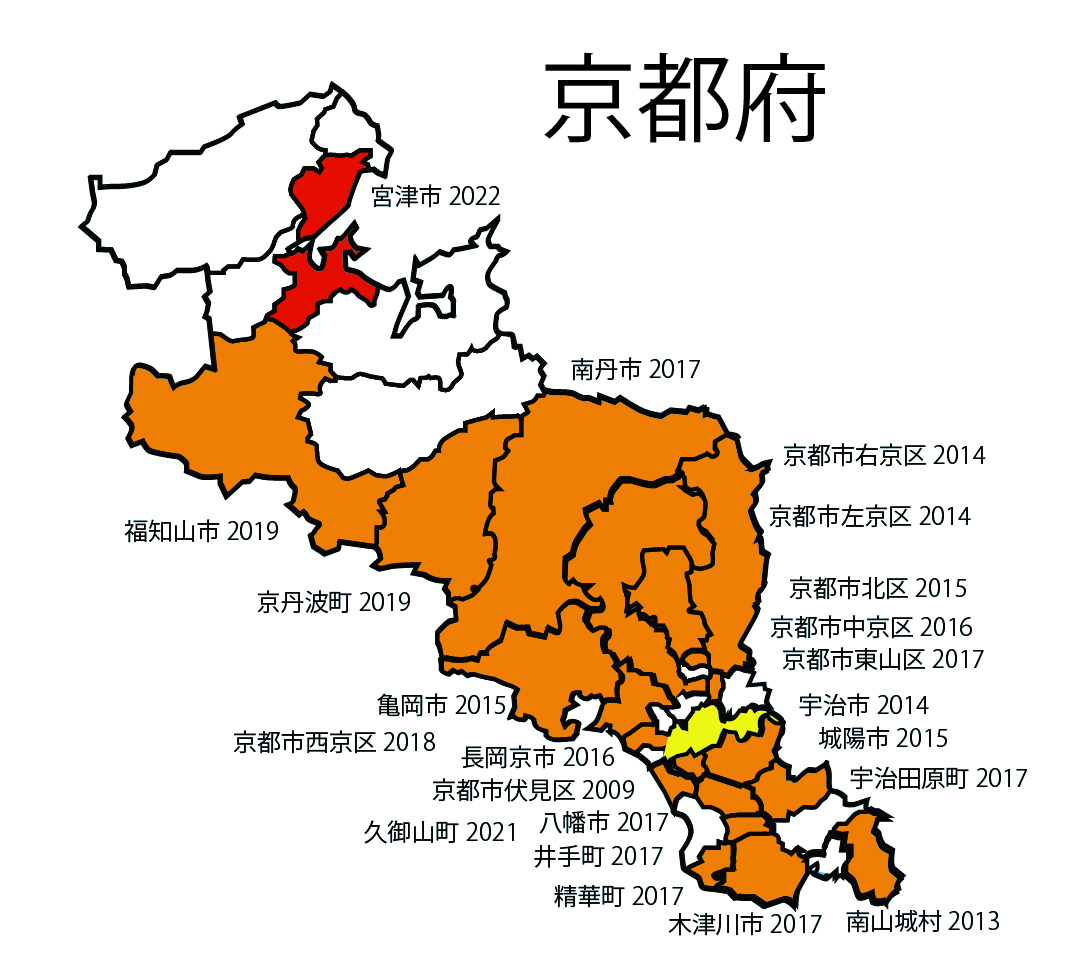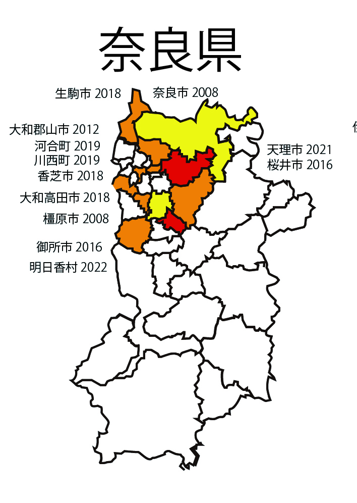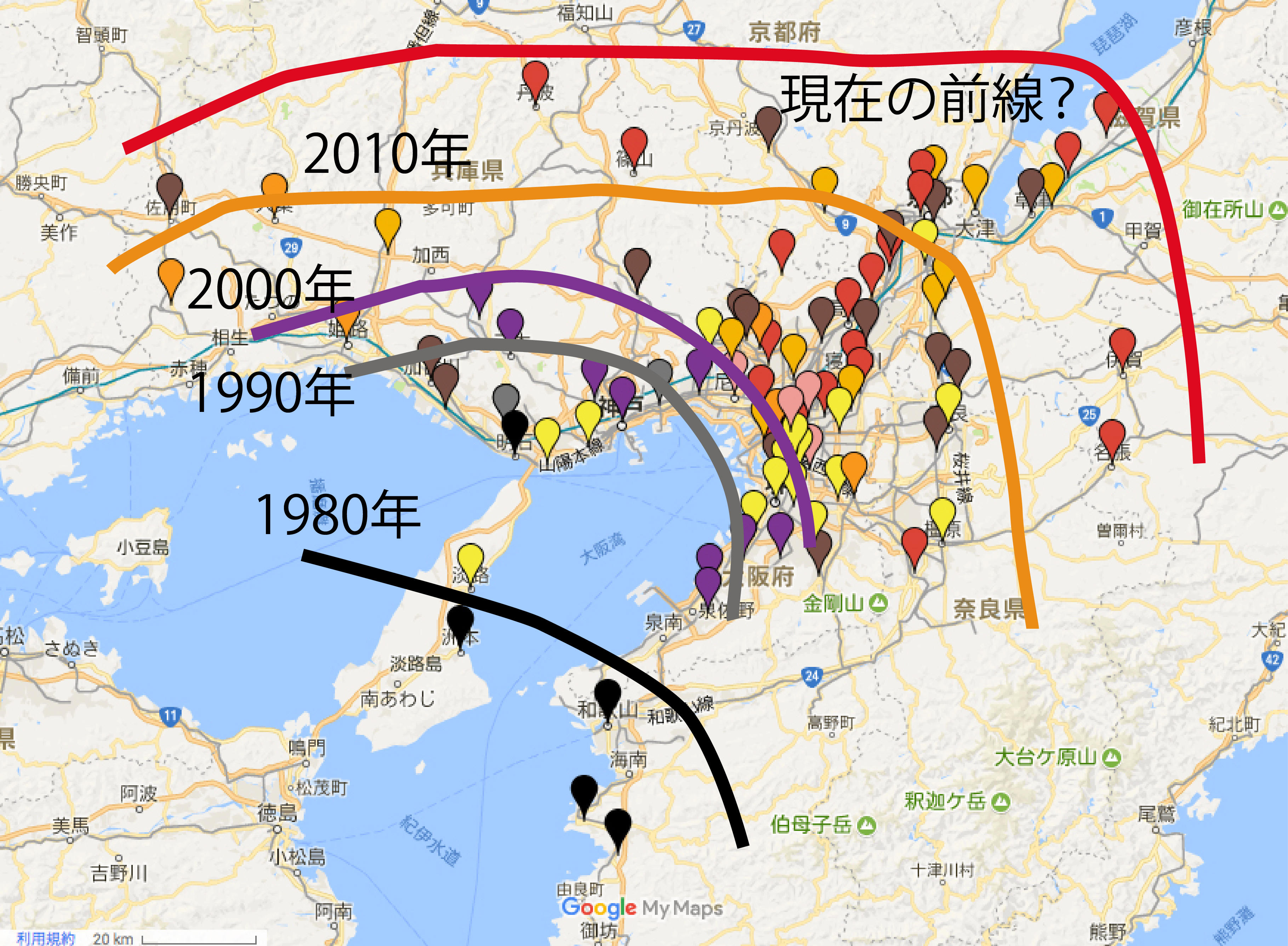 | ●近畿2府5県で、まだ記録のない市区町村の分布情報を募集 (※既に記録がある市区町村についてはご連絡不要です) ※既に記録があるところでも、より早い年の記録をご存知でしたら、お願いします。2022年秋ごろにまとめて論文化します。 ■〜1980年以前、■1981〜1990年、■1991〜2000年、■2001〜2010年、■2011〜2020年、■2021〜2022年 |